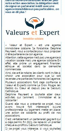 Valeurs et Expert reverse systématiquement, devant le notaire, une partie de ses honoraires au profit d’associations humanitaires locales,” souligne l’article. Parmi ces associations, on retrouve le Secours catholique, les Restos du cœur, la Croix-Rouge ou encore Enfance et Partage. Ces donations permettent de financer des actions concrètes pour soutenir les plus démunis, transformant chaque transaction immobilière en une action solidaire impactante.Simplicité, professionnalisme et solidarité pour les clients